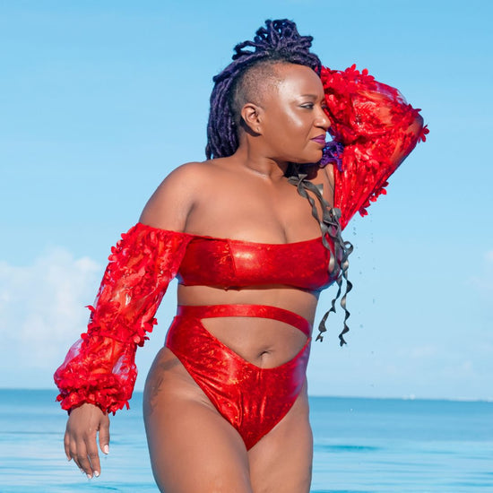 Lacey is a gorgeous suit. The delicate details on the sleeve are absolutely beautiful and eye catching. It's such a well crafted suit that ANY body looks good in. It would also look good as a bodysuit with bottoms.