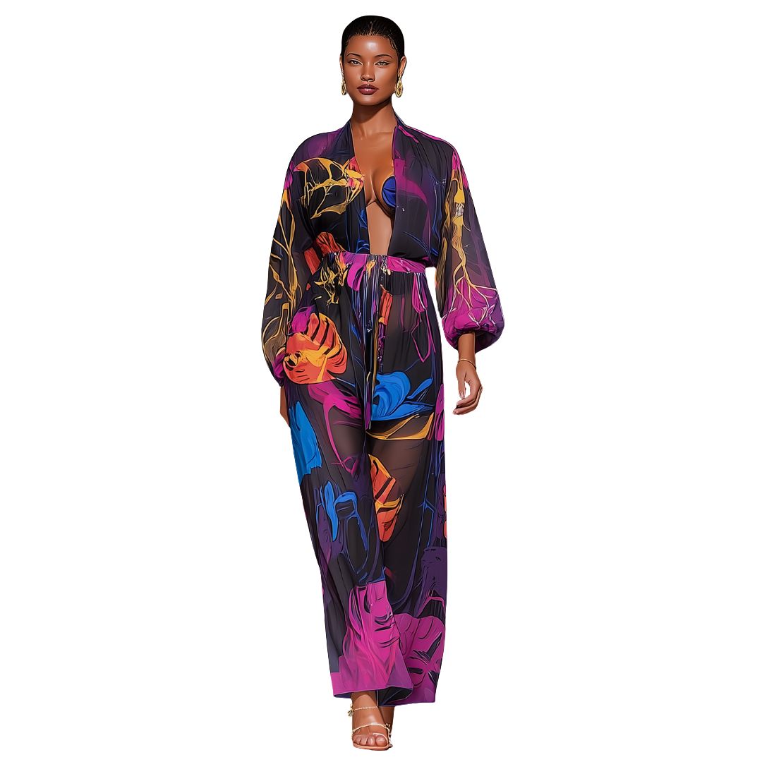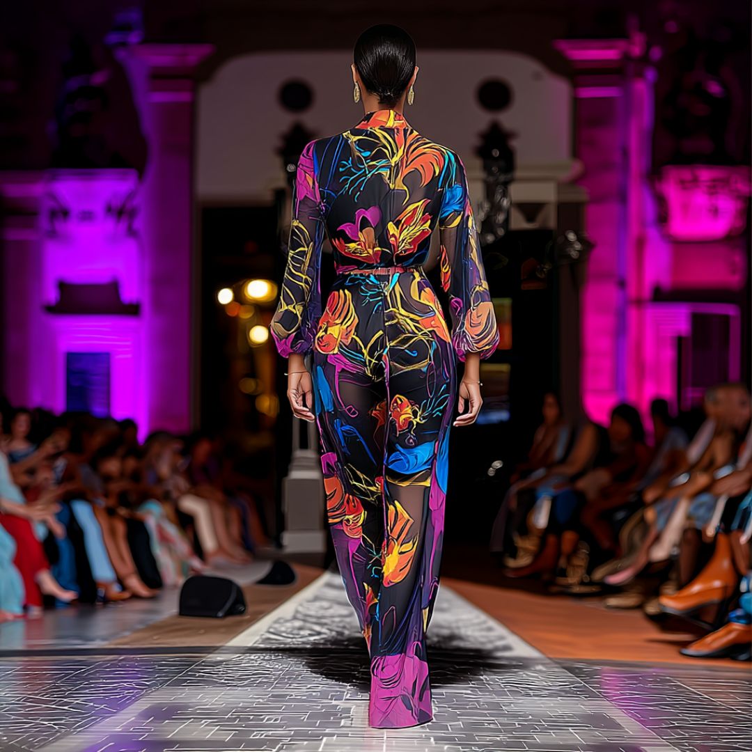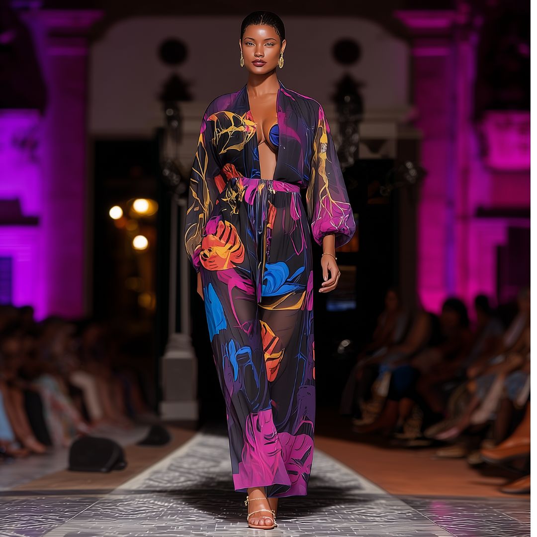 For the Girlie, who travels in style, we offer the Cabana Queen jumpsuit—your crown jewel of resort glam. This sheer stunner features dramatic blouson sleeves, a plunging neckline, and an elastic waist with a tie to cinch your curves just right. Side pockets keep it cool and practical, while the bold Island Tempo print ensures you rule every rooftop, beach, or fête with effortless flair.