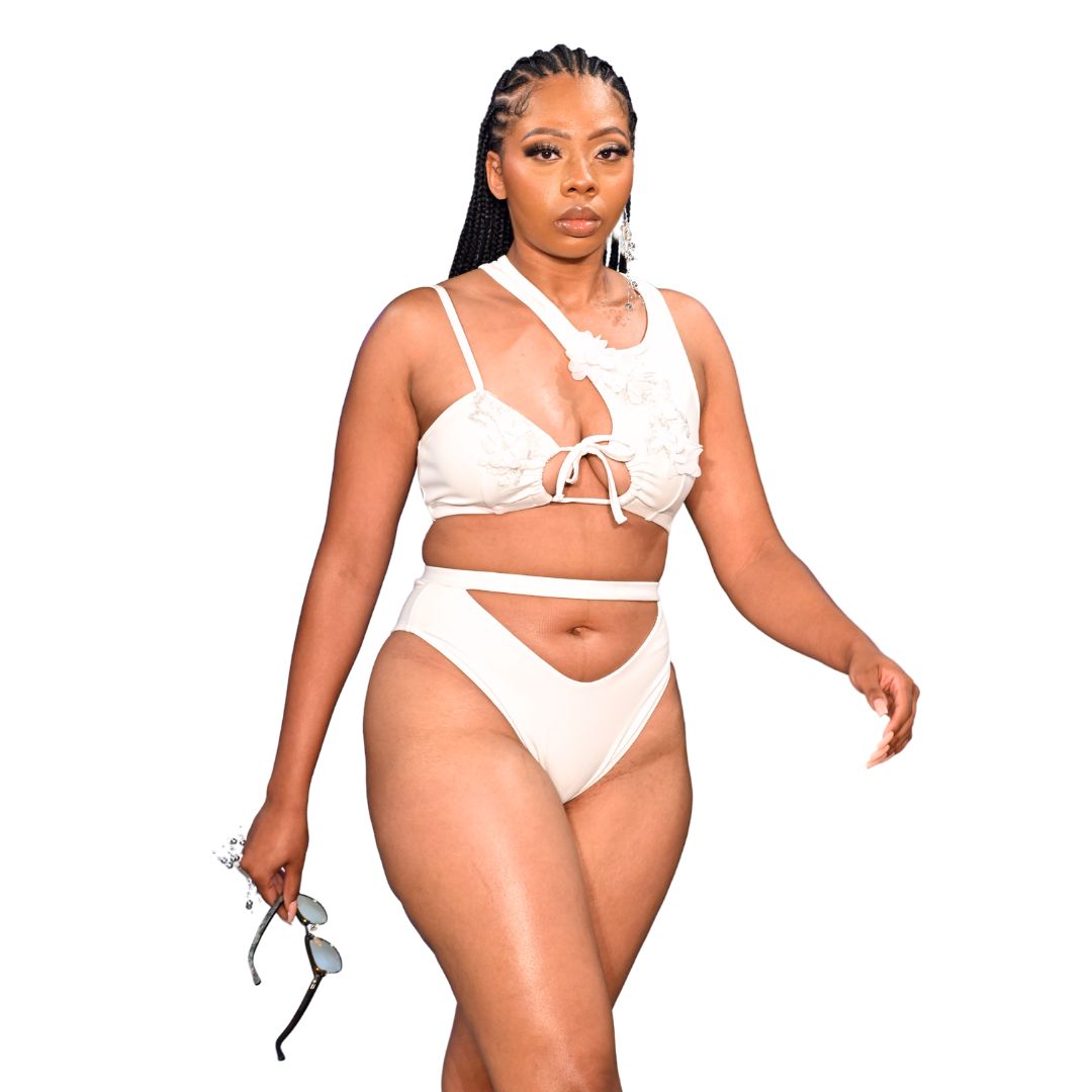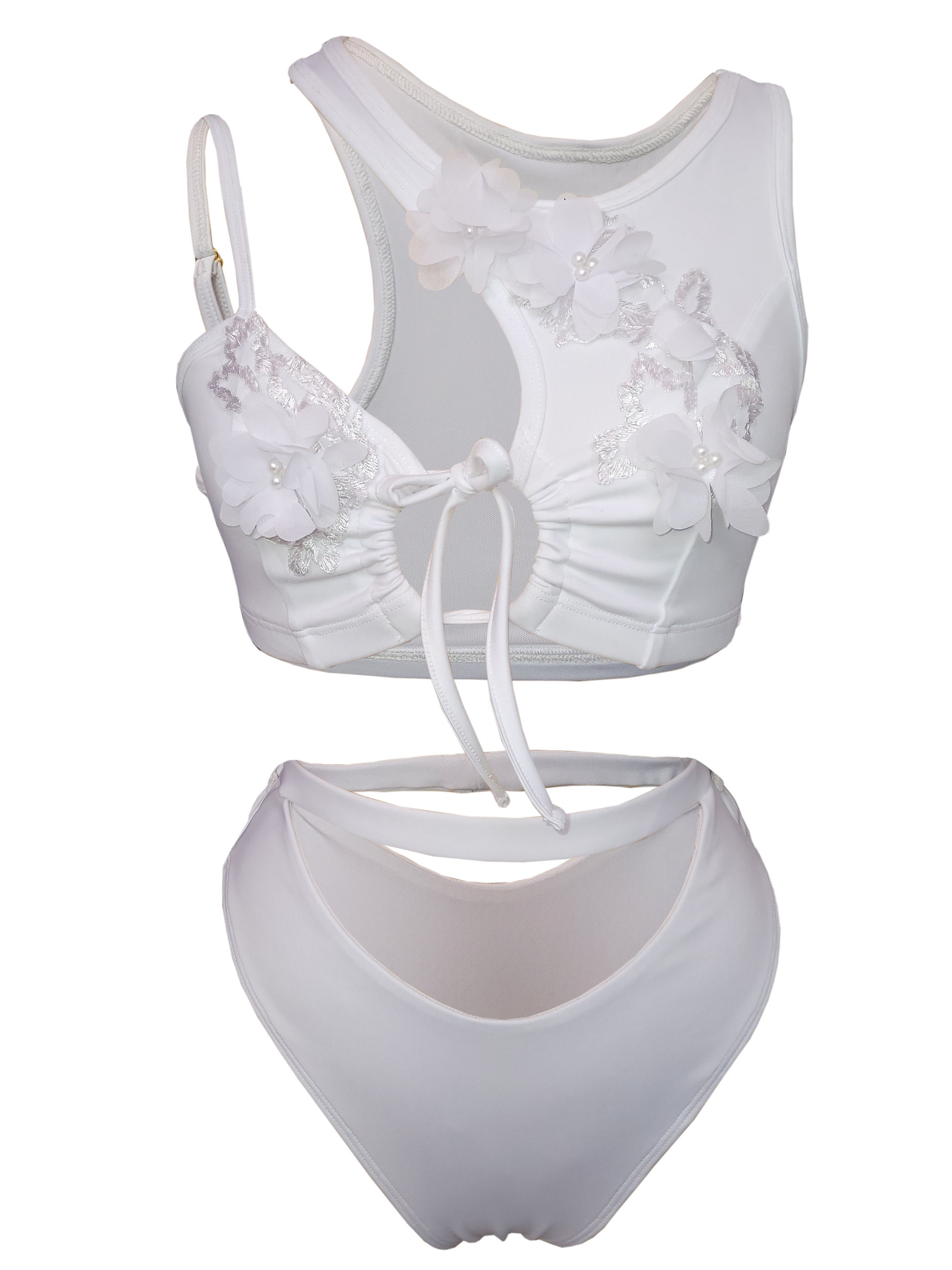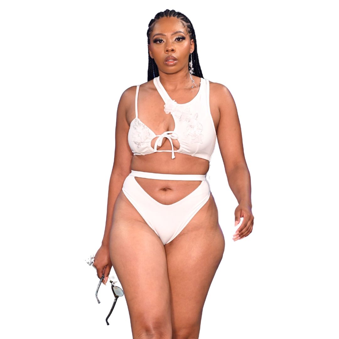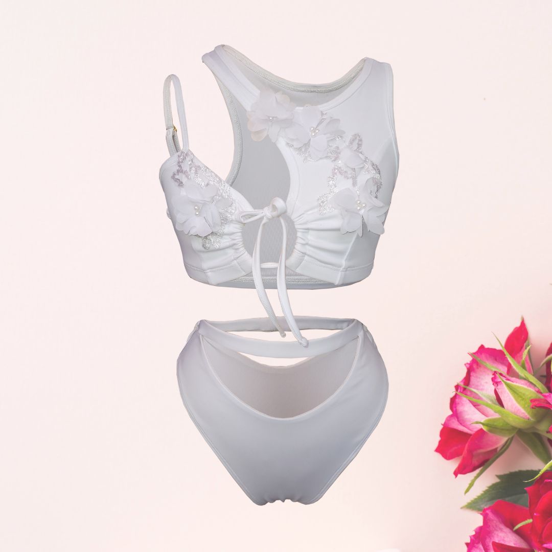 Pretty as a Pearl. This Asymmetric Bra has full adjustable support with front tie and shoulder strap. The High Neck and Princess seams gives full support to the "girls". The icing on this beautiful cake is the 3-d flower appliques that have beaded pearls, definition and texture. The perfect pairing is our new High Waist Cut-out Cheeky Bikini. Want a fuller bottom? Just let us know in the Special Request and we will gladly accommodate you.