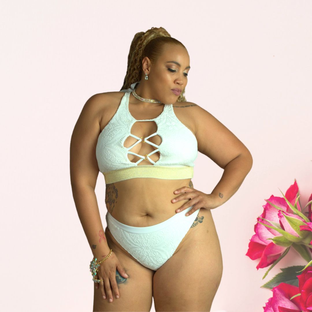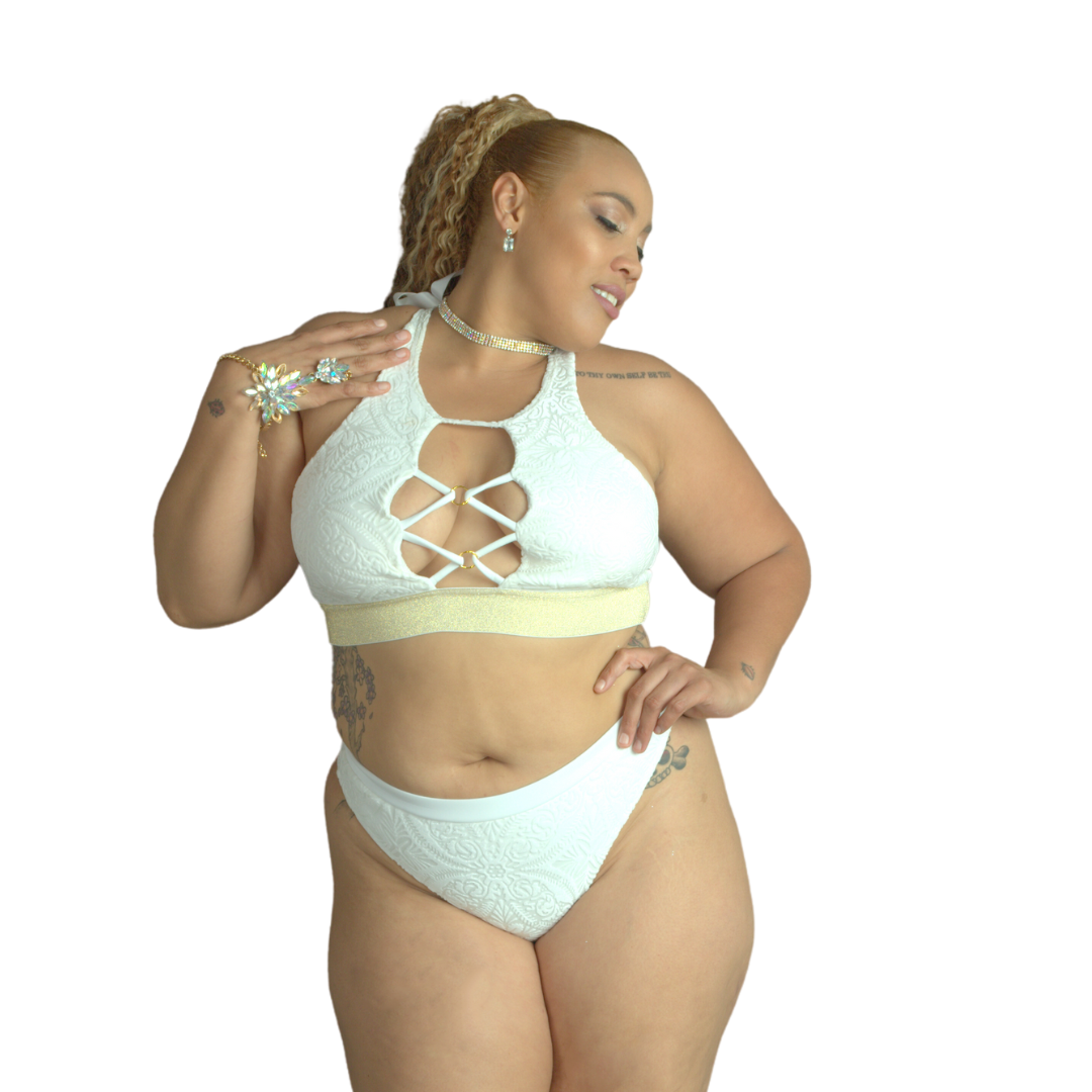 Pretty as a Pearl. This High Neck Long Waist Strappy Bra has front cut-out detail interlocked to hold it together. Ultra supported with soft cups and wide elastic.