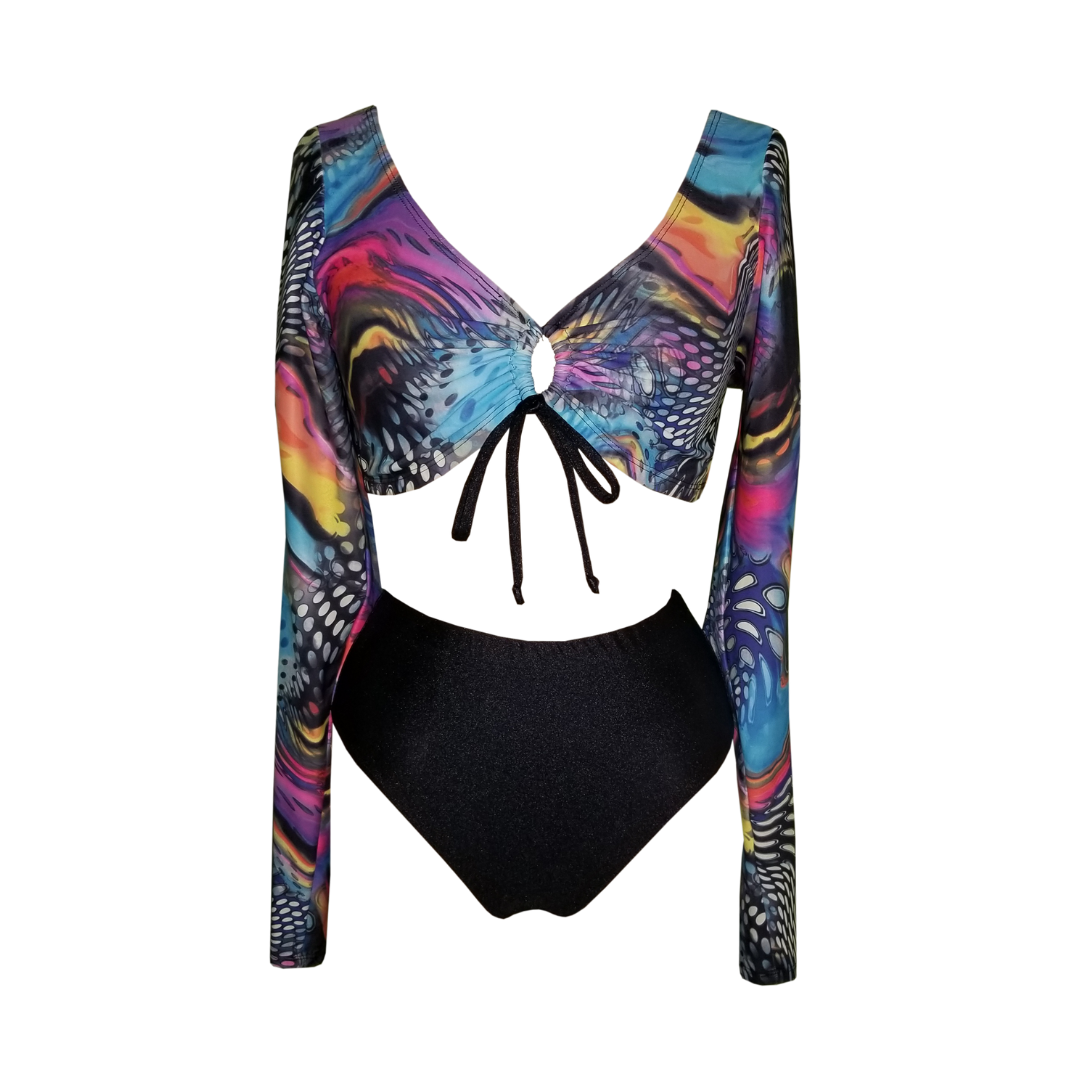 This Trendy Long Sleeve Crop Top is perfect for arm coverage or simply to rock something different. With front drawstring you can create the amount of cleavage you desire. Sheer sleeve detail makes it not only cute, but airy for comfort. Paired with our High Waist Bikini